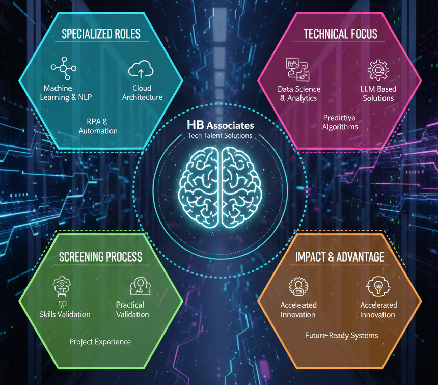HB Associates specializes in sourcing AI and emerging technology talent with strong technical foundations, real project exposure, and the ability to work within modern digital ecosystems. We identify specialists in machine learning, NLP, automation engineering, cloud architecture, RPA development, predictive analytics, and LLM based solutions. Our screening process validates practical skills and problem solving capabilities.