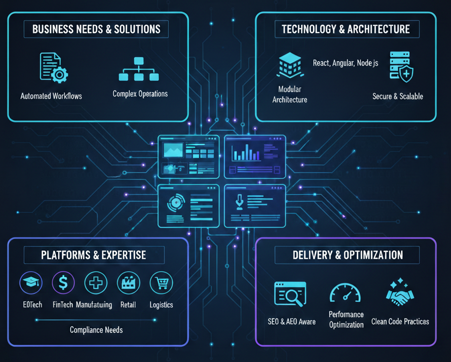 We bring strong domain expertise across EdTech, FinTech, Manufacturing, Healthcare, Retail, Logistics, and Service based businesses. This domain understanding allows us to design applications that match real world workflows, compliance needs, and user behavior. Our custom web applications are SEO and AEO aware, ensuring discoverability, clarity, and long term value.
