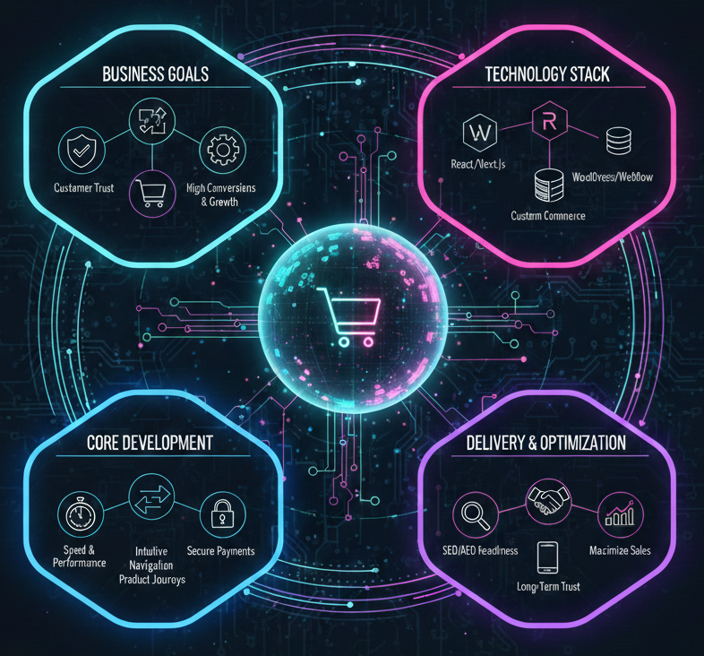 We develop modern websites using React based frameworks, WordPress, Webflow, and custom front end stacks, along with robust ecommerce solutions on Shopify and custom commerce architectures. Our ecommerce websites are designed with optimized product journeys, intuitive navigation, secure payment integration, inventory readiness, and mobile first experiences. Every build focuses on speed, usability, and conversion driven design to maximize sales and customer trust.