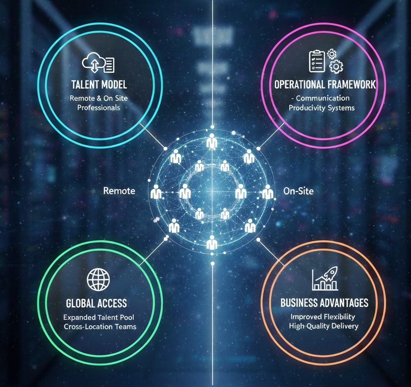 This approach improves operational flexibility, expands your access to global talent, and ensures high quality delivery regardless of location.