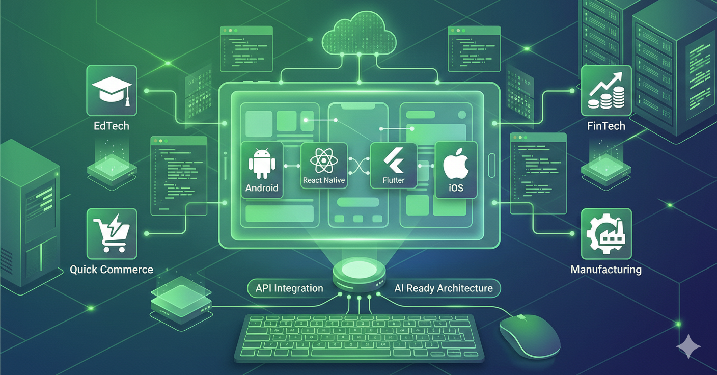 Our mobile solutions are tailored for specific domains such as EdTech learning apps, FinTech transaction platforms, quick commerce applications, manufacturing operations apps, and customer engagement tools. Each app is built with domain logic, user intent, and AI ready architecture to ensure strong adoption and future compatibility.