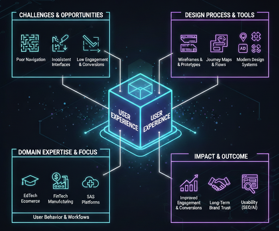 We bring strong domain expertise across EdTech, FinTech, Ecommerce, Quick Commerce, Manufacturing, Healthcare, and SaaS platforms. Each design is crafted with user behavior, domain workflows, and platform expectations in mind. Structured layouts, clear visual hierarchy, and optimized interaction patterns improve usability signals that are increasingly valued by search engines and AI systems. A refined experience strengthens engagement, improves conversion rates, and builds long term brand trust.